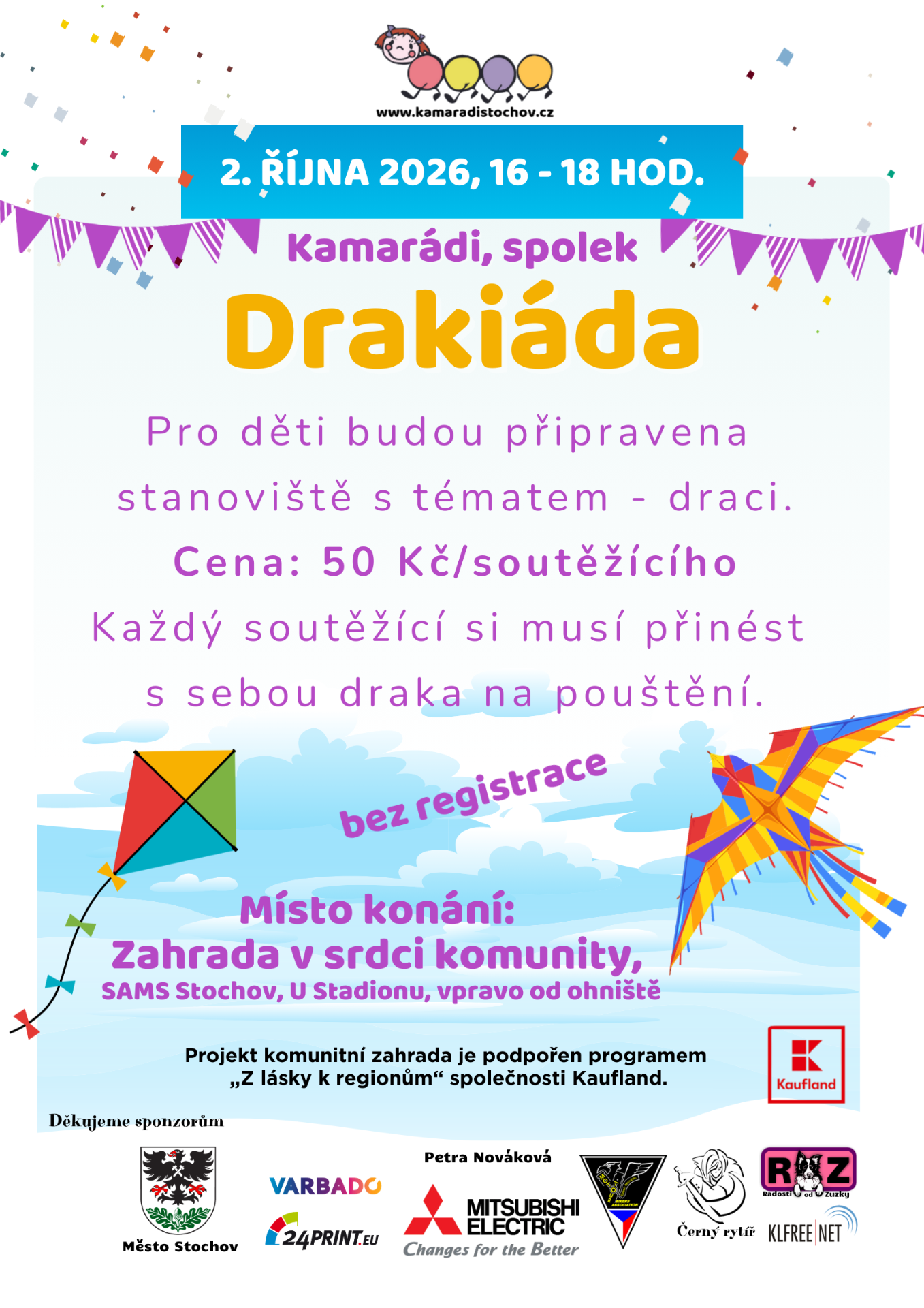 Popis: Drakiádou tradičně oslavujeme podzim a vždy si přejeme, aby nám nepršelo a alespoň trochu foukal vítr. Tuto akci pořádáme primárně pro děti z kroužků, ale mohou se přidat i ostatní děti s rodiči. Hry, které děti hrají, mají vždy souvislost s podzimem a s draky.