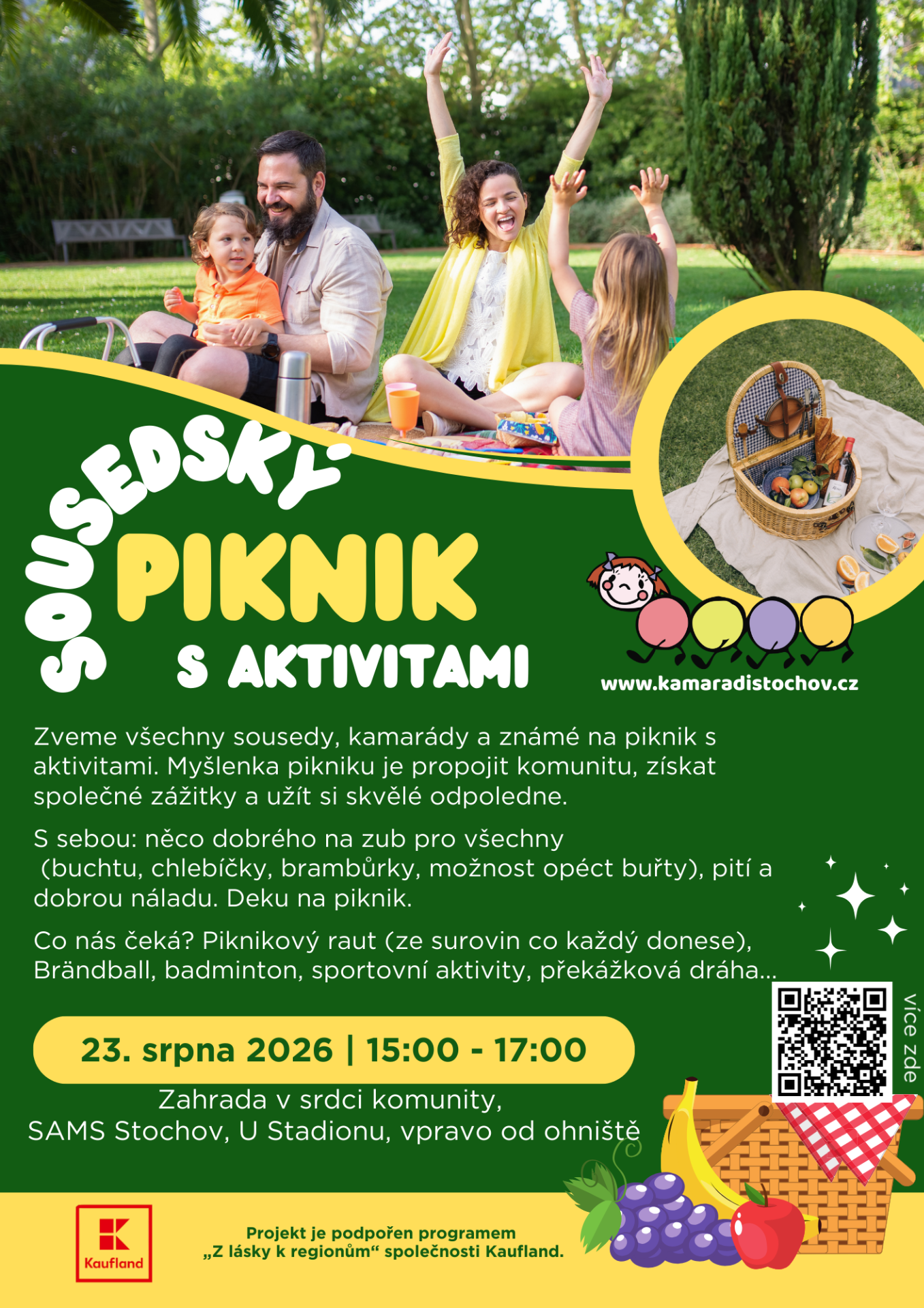 Popis: Zveme všechny sousedy, kamarády a známé na komunitní piknik plný aktivit! Tento piknik je skvělou příležitostí propojit naši komunitu, získat nové společné zážitky a užít si příjemné odpoledne.