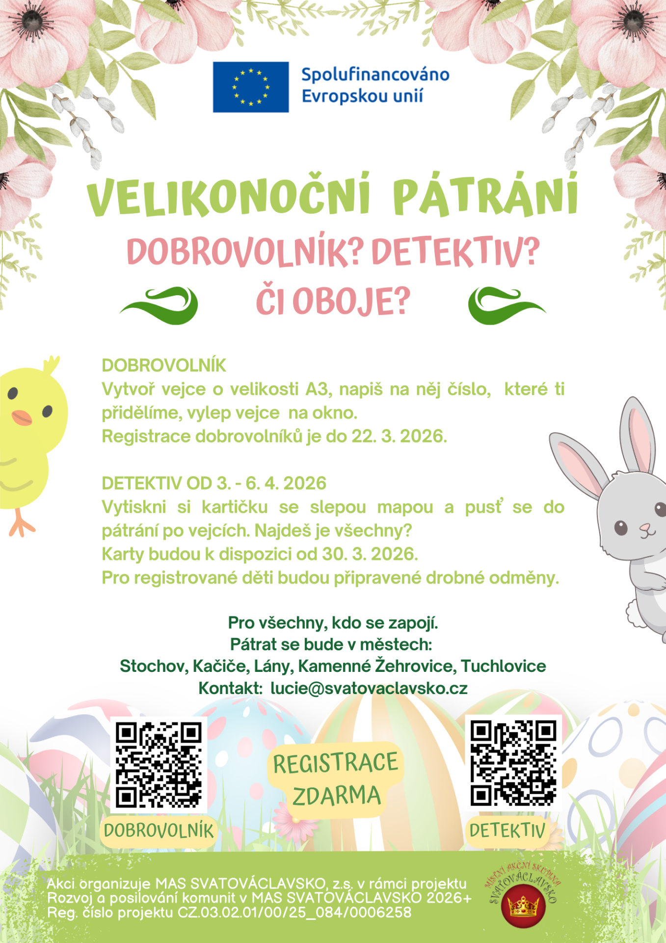 2024 jsem Velikonoční pátrání dítky spolupráci s MAS SVATOVÁCLAVSKO, z.s. rozšířili do více měst (Kačice, Lány, Kamenné Žehrovice a Stochov). Děkujeme za podporu.